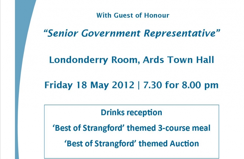 ‘Best of Strangford’ Dinner and Auction With Guest of Honour “Senior Government Representative” Londonderry Room, Ards Town Hall Friday 18 May 2012 | 7.30 for 8.00 pm Tickets £20 per person Register by emailing [email protected] or calling the Conservative Party Office on 028 9185 9073. Limited places. Booking closes on Monday 14 May 2012